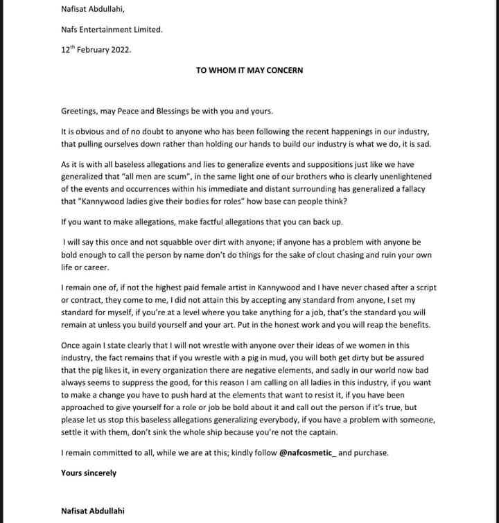 Idan abinda yake fada Gaskiya ne Kuma yana da hujjoji da Kuma shaidu, ina cikin mutanen da suke so su san su waye Masu yin hakan! Tunda ya fadawa duniya cewa ga abinda ake yi, toh karshen adalci wa Wanda aka zalunta shine mu san su waye Kuma mu dauki Mataki akan su, Dan a cikin Laws din mu na kasar nan da Kuma film industry din, babu inda it’s acceptable to say a lady should sleep with you for films. There are consequences and the people who’re guilty should be seriously punished.